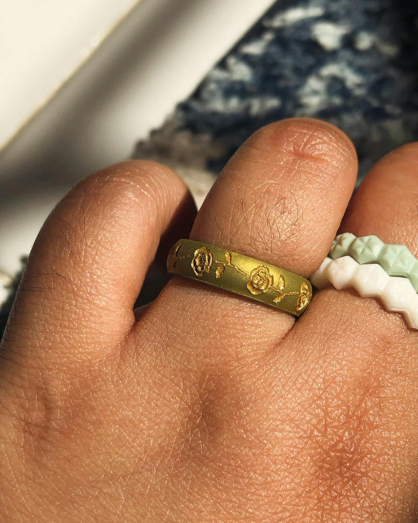 Crafted from 100% hypoallergenic, food-grade silicone, our rings are safe for all skin types. Even our metallic pigments are metal-free. Colors are infused throughout the ring - not just coated - so they stay vibrant, wear after wear.